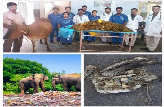 திறந்த வெளியில் வீசப்படும் நெகிழி கழிவுகள் நிலப்பரப்பில் வாழும் பறவைகள் மற்றும் விலங்குகளின் உணவில் கலந்து அவற்றை உயிரிழக்கச் செய்கிறது.