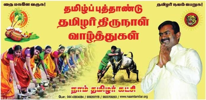 அடுத்து மிகப் பெரிய எழுத்துக்களாக, “தை 1 தமிழ்ப் புத்தாண்டு மற்றும் பொங்கல் நல்வாழ்த்துகள்” “பனையூரில் புலிக்கொடி ஏற்றும் நிகழ்வு” என்றும், அதனடியில் சற்று சிறிதாக “நாம் தமிழா சட்சி” என்றும் அச்சிடப்பட்டிருந்தது.