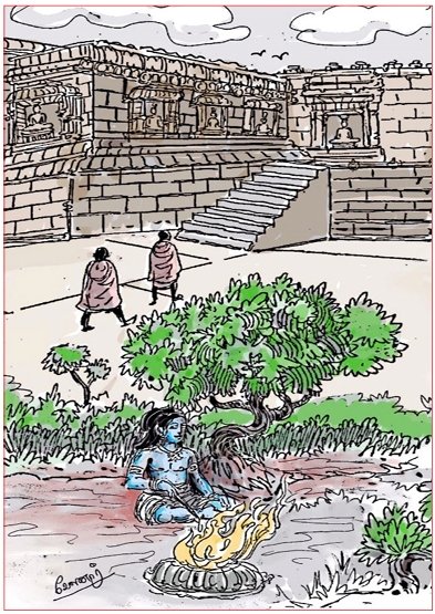 வேள்வியின் விளைவாக எழும்பும் புகையை வெறுத்து அஞ்சி அவ்விடம் தங்கியிருந்த குயில்கள் தன் பெரும் கரிய பெண் குயில்களோடு பறந்து சென்று யாரும் நுழைய இயலாத பூதங்கள் காவல் செய்யும் கடுமையான காவல் கொண்ட காளிக்கோட்டத்திற்குச் செல்லும்.