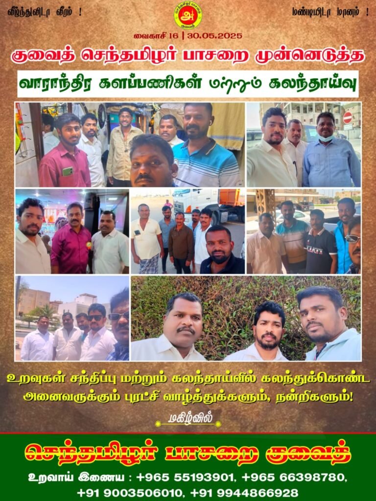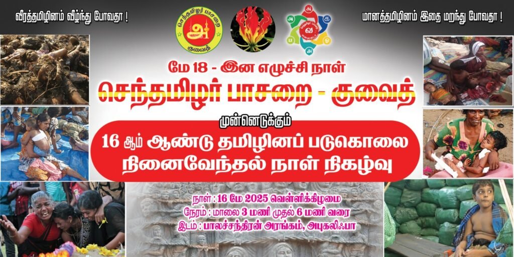 குவைத் செந்தமிழர் பாசறை முன்னெடுத்த 16 ஆம் ஆண்டு இன எழுச்சி நாள் (தமிழினப் படுகொலை) நினைவேந்தல் நிகழ்வு 16.05.2025 (வெள்ளிக்கிழமை) குவைத் பாலச்சந்திரன் அரங்கில் நடைபெற்றது. இந்நிகழ்வில் 150 க்கும் அதிகமான தமிழ் உறவுகள் இன உணர்வோடு கலந்துக்கொண்டனர்.