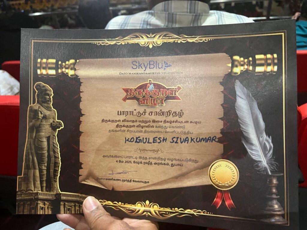 செந்தமிழ் பாசறை – அமீரகம் தமிழி வகுப்பு மாணவர் கோகுலேஸ் திருக்குறள் போட்டியில் கலந்து கொண்டு பரிசு பெற்றார்.