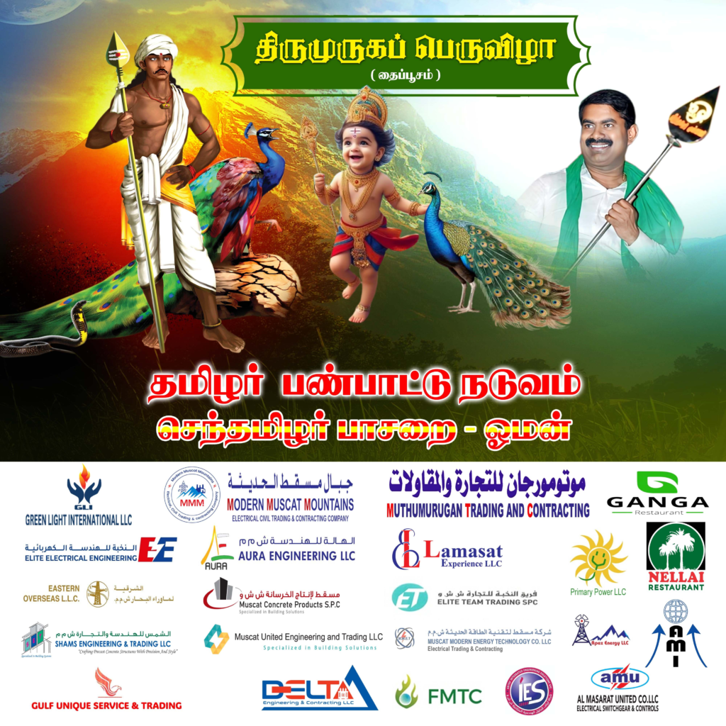 செந்தமிழர் பாசறை – ஓமன் & தமிழர் பண்பாட்டு நடுவம் இணைந்து முன்னெடுக்கும் திருமுருகப் பெருவிழா மாசி 2 ஆம் நாள் (பிப்ரவரி 14 ஆம் தேதி) மசுகட் & சலாலா நகரங்களில் நடைபெறவிருக்கிறது. சுமார் 50க்கும் மேற்பட்ட பால்குடங்கள், காவடி உட்பட தேர்வலம் நடத்தவும் ஏற்பாடு செய்யப்பட்டுள்ளது. சுமார் 500 க்கும் மேற்பட்ட நபர்கள் மசுகட் நகரிலும், சுமார் 150 க்கும் மேற்பட்ட நபர்கள் சலாலா நகரிலும் பங்கெடுக்கவிருக்கிறார்கள்.